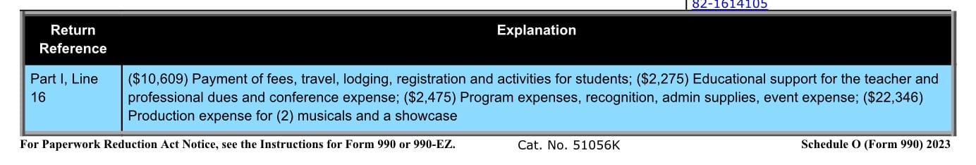 Cobb County has a separate foundation for all of the schools that seems to take in $500,000 in donations every year and has another $500,000 in investments, disseminating about $800,000 in scholarships, “family stabilization” grants and individual gifts to schools. They don’t have any theater listed in their itemized expenses…but yes, to art supplies…perhaps scene paint. I put this STEAM foundation up because I think it really does pay for the balance of the STEAM kids’ college tuition for students under the median income for the district. Wow. The theater foundation looks new. The “staff” works for free and the only staff seems to be the theater director at the school. $30,000 in ticket sales and $25,000 in donations?!?! That sounds very good to me…