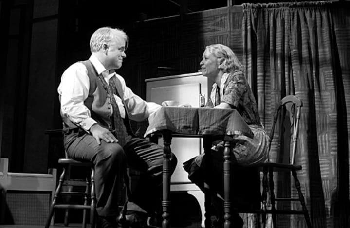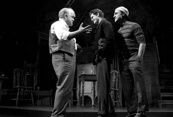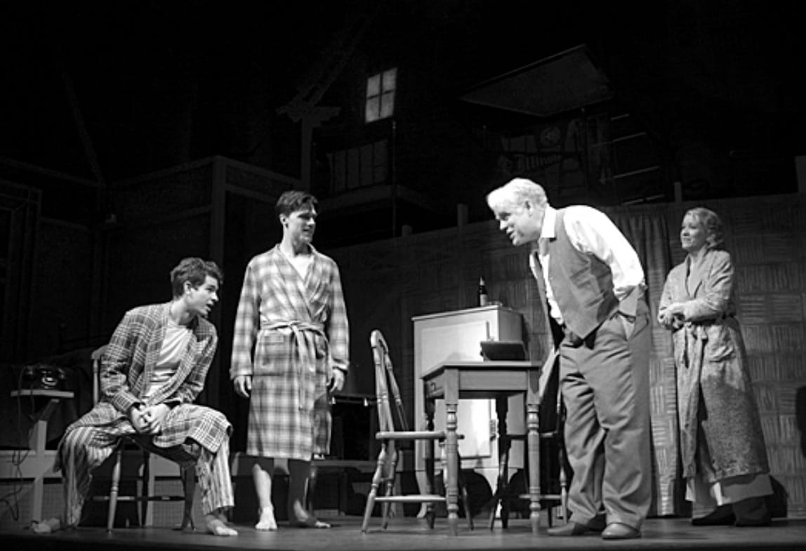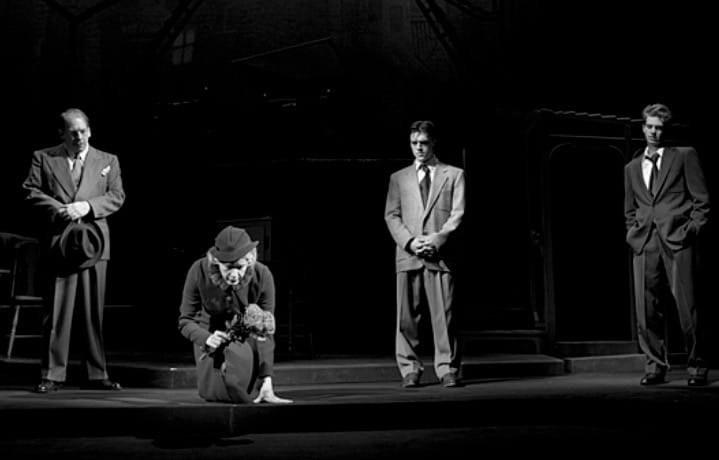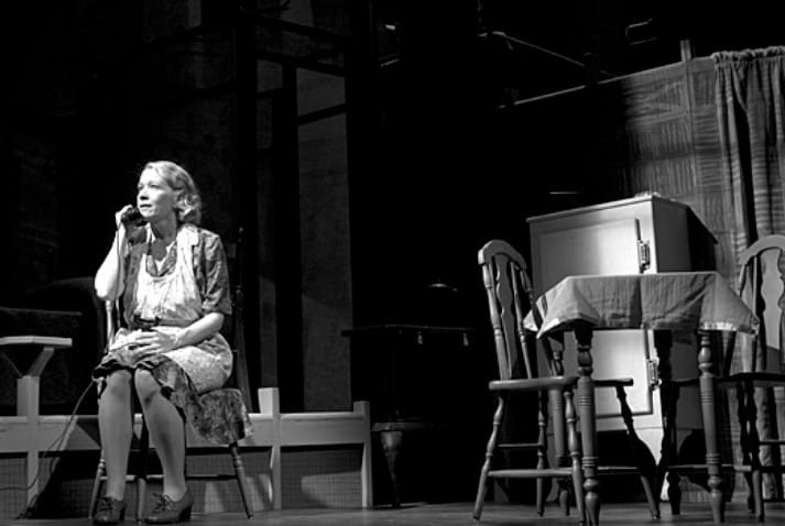 Okay. Real furniture that has not been doctored to look stylized, and a classic theater-style painted background = drab. This one is lit beautifully, we can tell by those black and white photos above. But the reality of Willy’s surroundings and the clothing has no sitcom optimism; especially for the actors onstage.