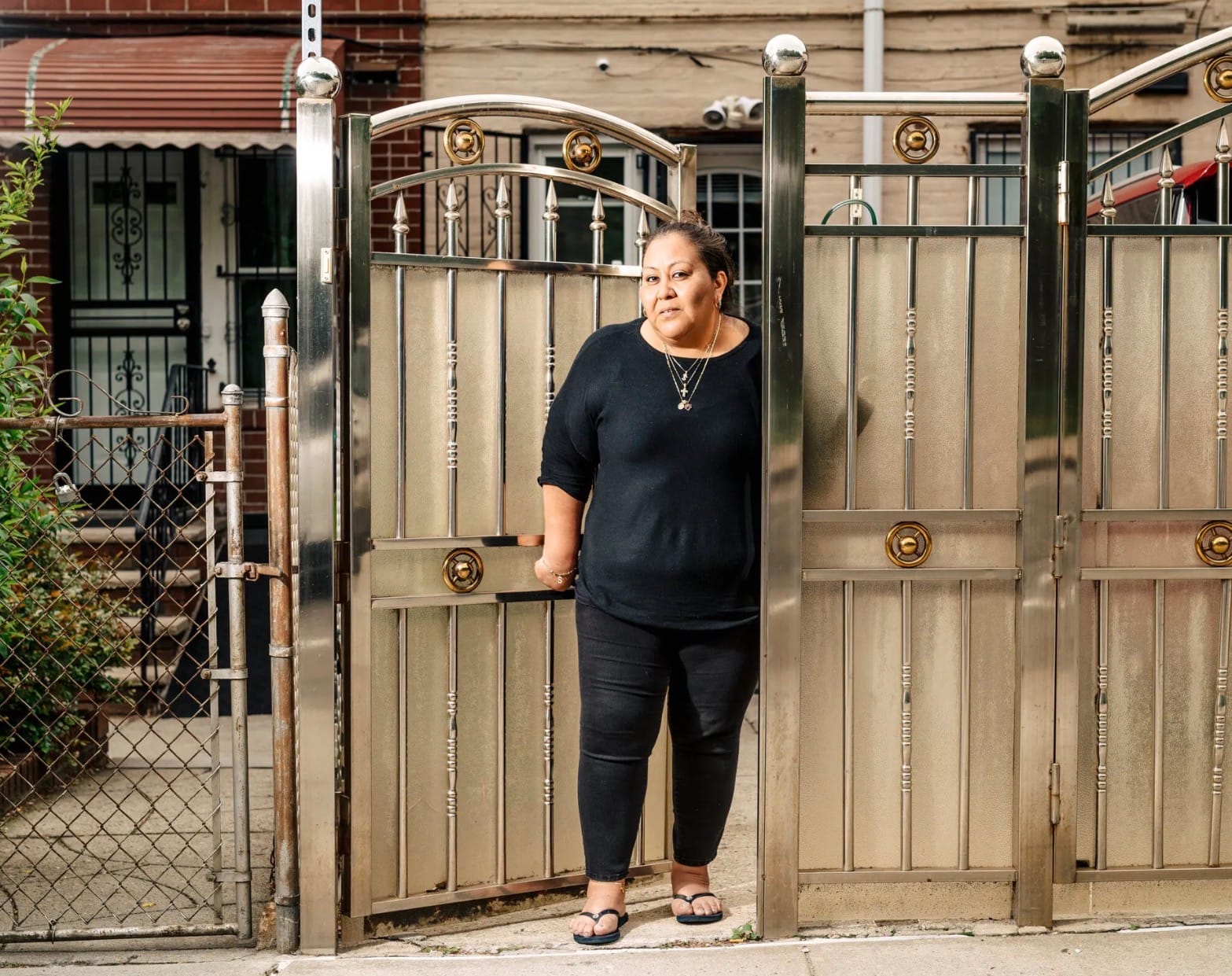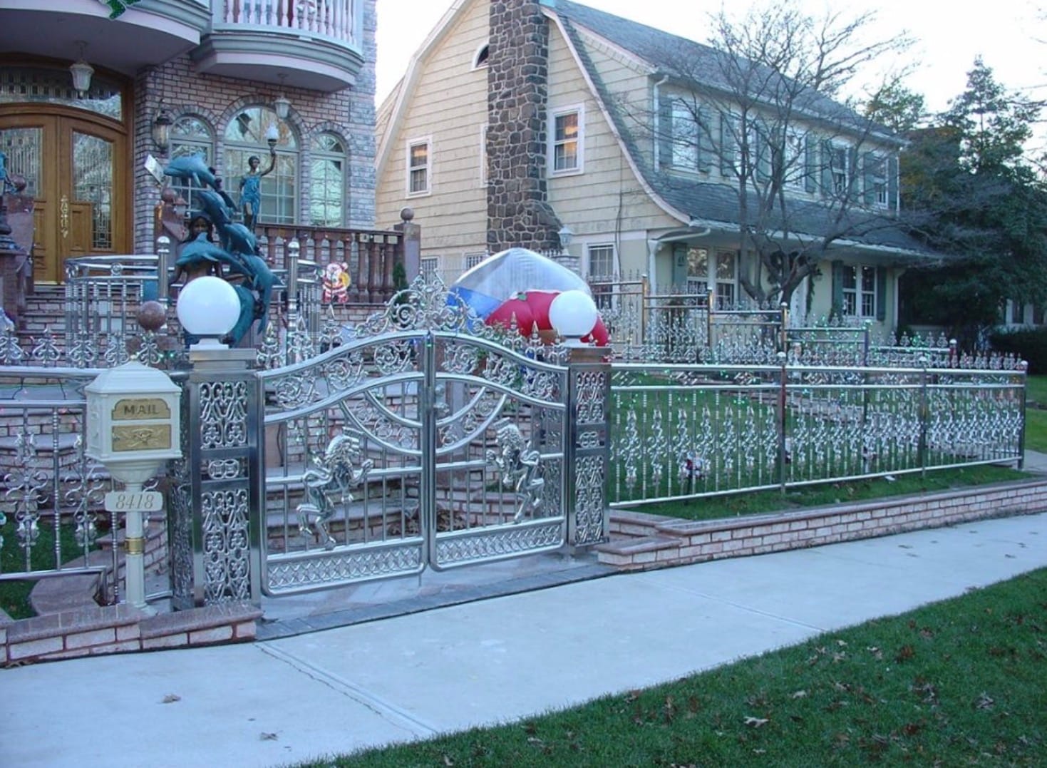 The reigning queen of my Boston-adjacent neighborhood wears giant lavender sunglasses, yells “hello, darling!” from a block away and calls her granddaughter princess. She exits the driveway with a stroller every morning flanked by two concrete lions she painted gold. In our neighborhood she is one of a kind, and the only house with a regal gate. In Queens she is one of several million of a kind. Are most New Yorkers monarchs? The New York Times photos from that article do not explain the ubiquity of these gates.