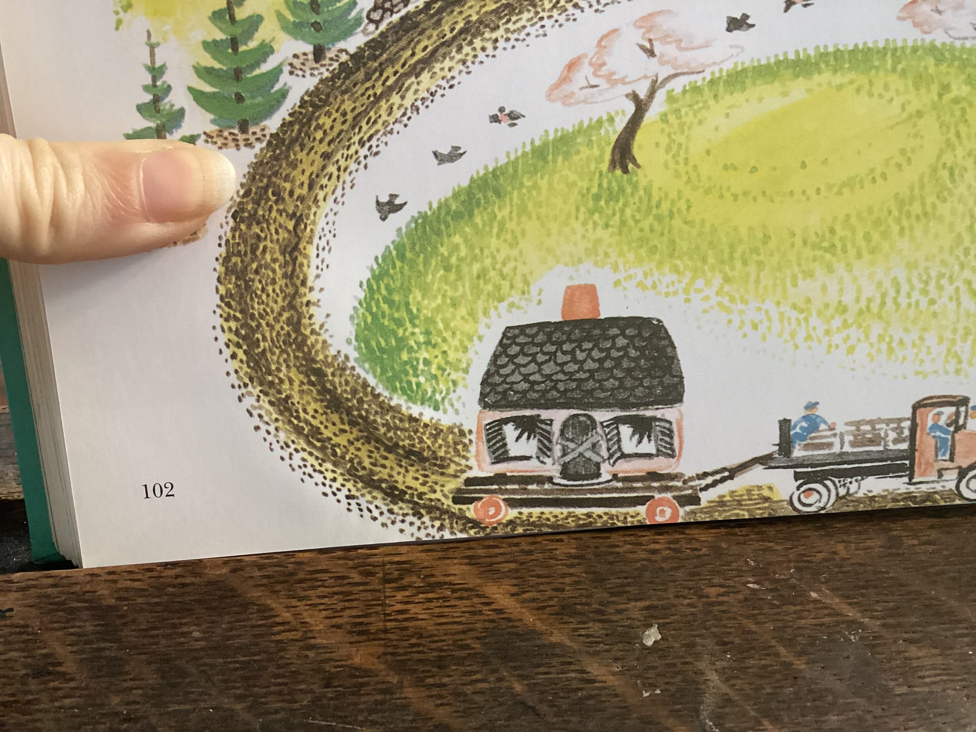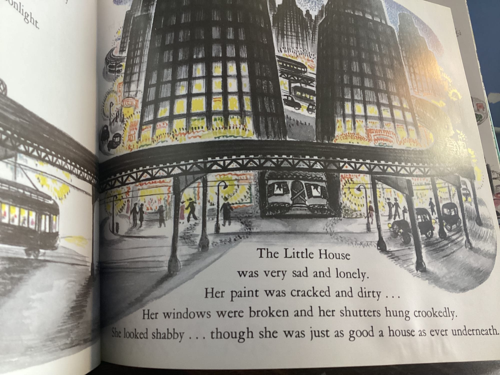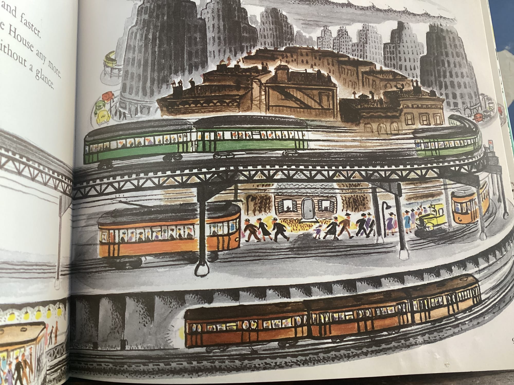 If you needed Ms. Burton to clarify that the house ”was very sad and lonely” by that first page, you didn’t need those words by the last one. Yeesh y‘ins. Beat up! Opportunity lost here, Ms. Burton. Upon her rescue she could have been smiling with some bricks missing on that front grill. That’s the little house at the end of the book, on her way back out to the country to live another hundred years happily.