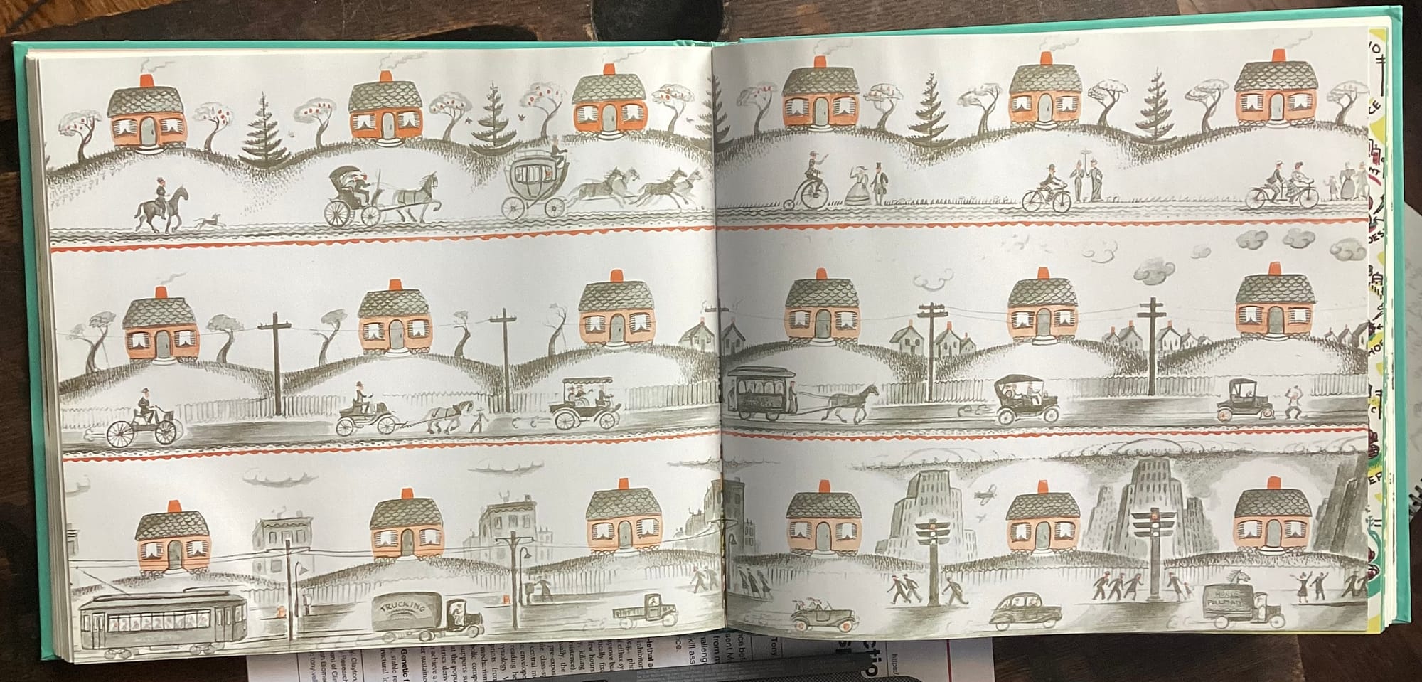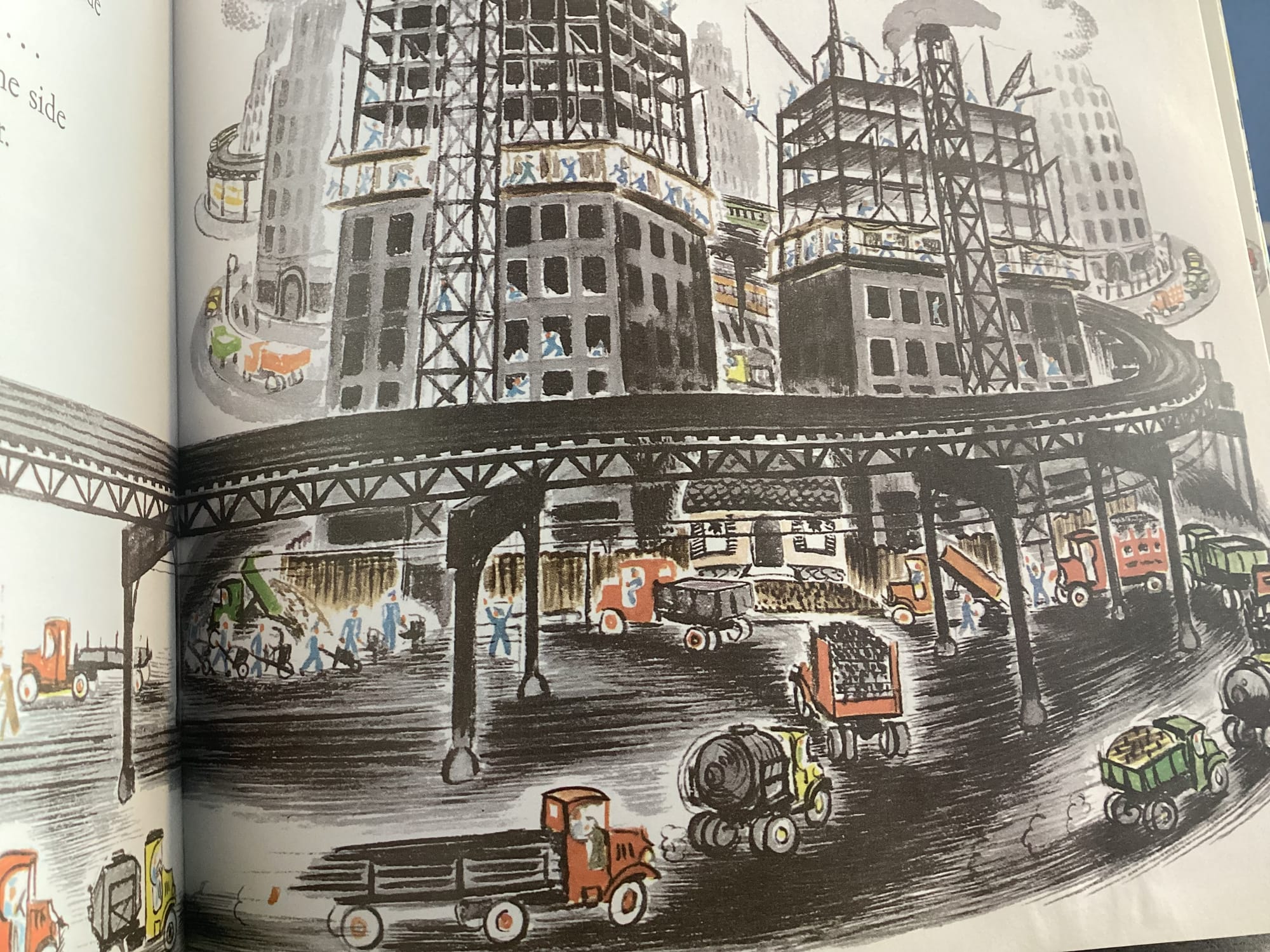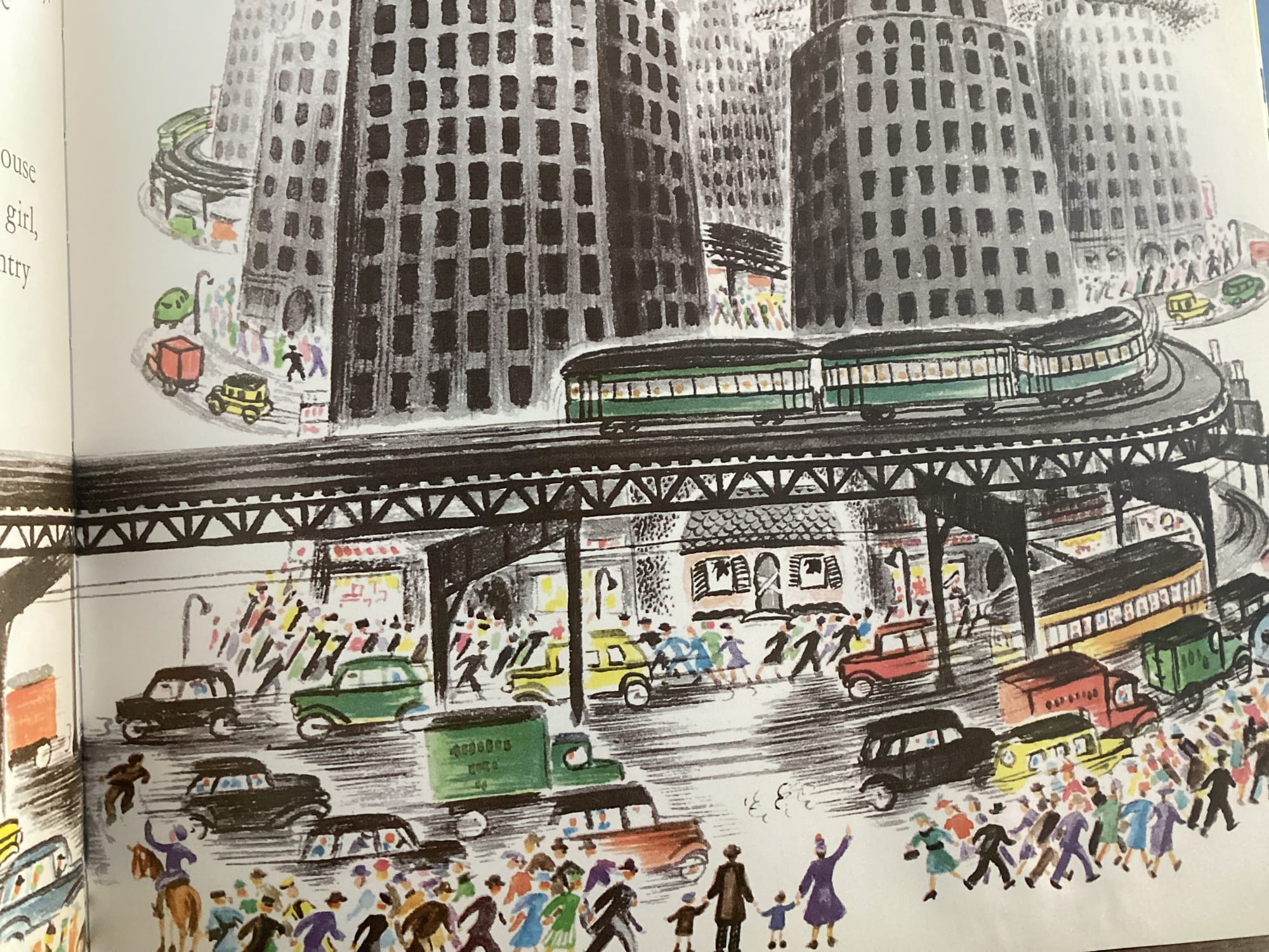 If you needed Ms. Burton to clarify that the house ”was very sad and lonely” by that first page, you didn’t need those words by the last one. Yeesh y‘ins. Beat up! Opportunity lost here, Ms. Burton. Upon her rescue she could have been smiling with some bricks missing on that front grill. That’s the little house at the end of the book, on her way back out to the country to live another hundred years happily.