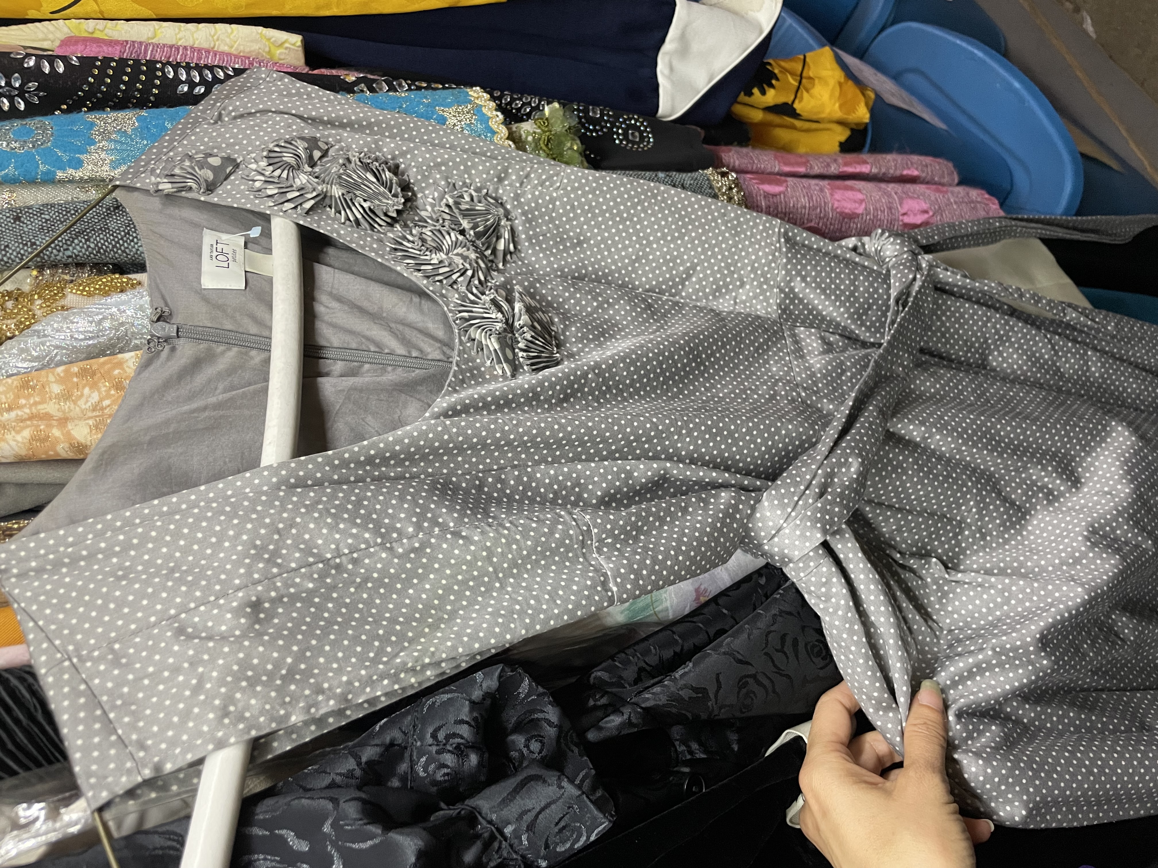The grey dotted one with the pleated flowers has an Ann Taylor tag - that's a gimmee. I am banking on that one being able to fool folks. ...I will remove the tag and see if the actor or crew person it lands on thinks it is from the 1950s.